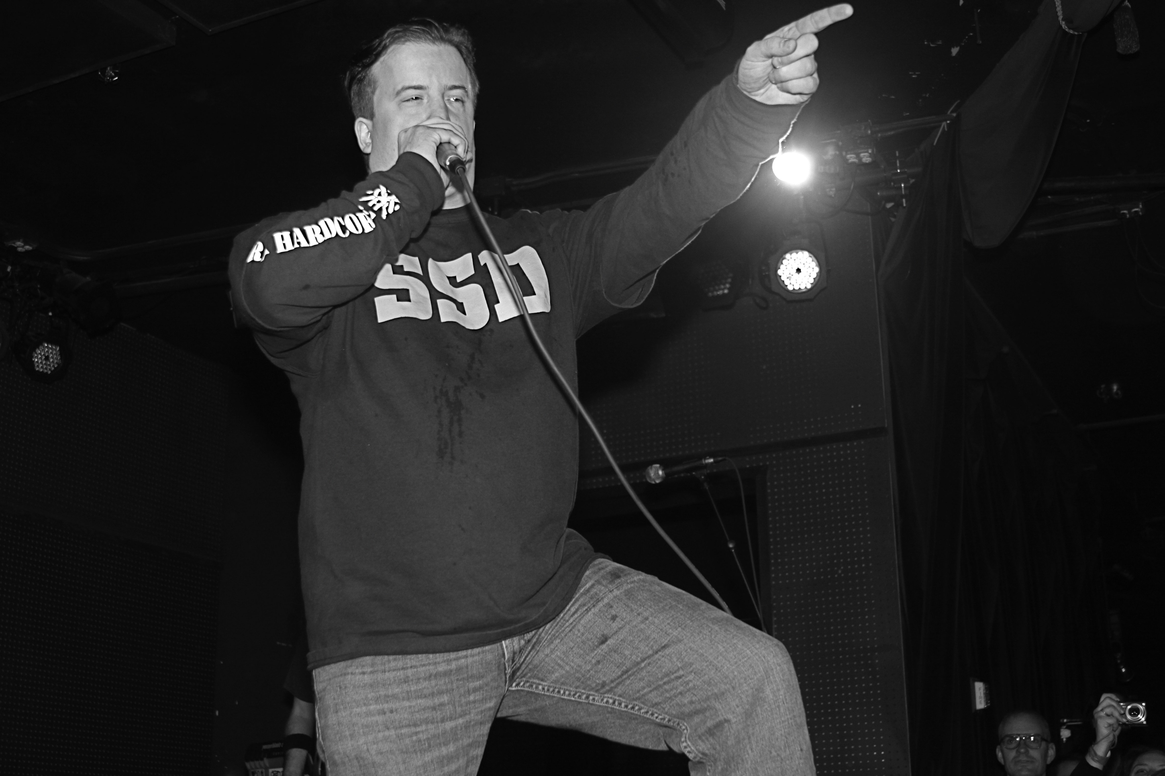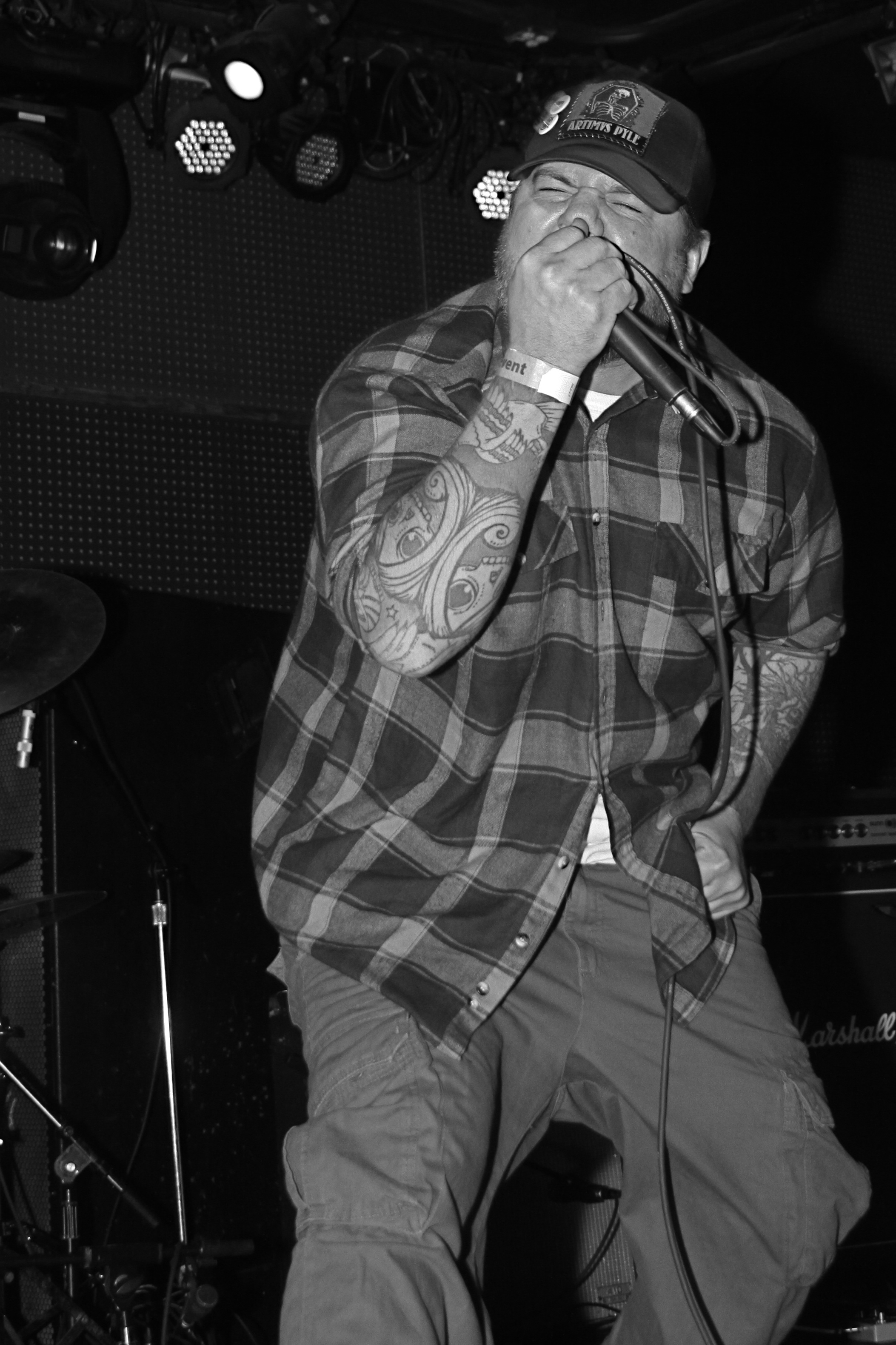 I recall going to countless shows throughout the tristate during that long lost decade known as the nineties. Armed with my Nikon FM2, my 50mm lens and a couple of rolls of film. I documented each and every show I attended with an unrealistic enthusiasm that I was doing something unique and special. I had an entire linen closets of carefully described negatives, contact sheets and slides. Yet somehow, after numerous moves from my Hell’s Kitchen apartment. That gift for organization took a hit. Leaving many of the lesser known names on the bills nameless. Decades later, I can strangely recall when and where these shots were taken without an inkling on the name of the subject or the band they performed with.This image was taken at CBGB’s i the late 90’s. If I can recall, the bill featured a few Oi/Street Punk acts of the time. (Not my thing, but…) Featuring the clique blue collar, buzzed hair, and mutten chops. Your guess is good as any. If you have any idea, please share.
